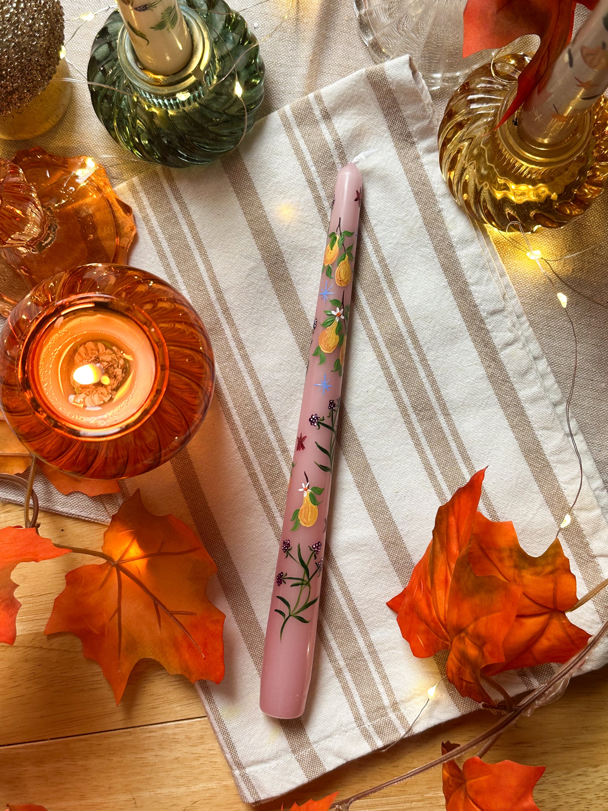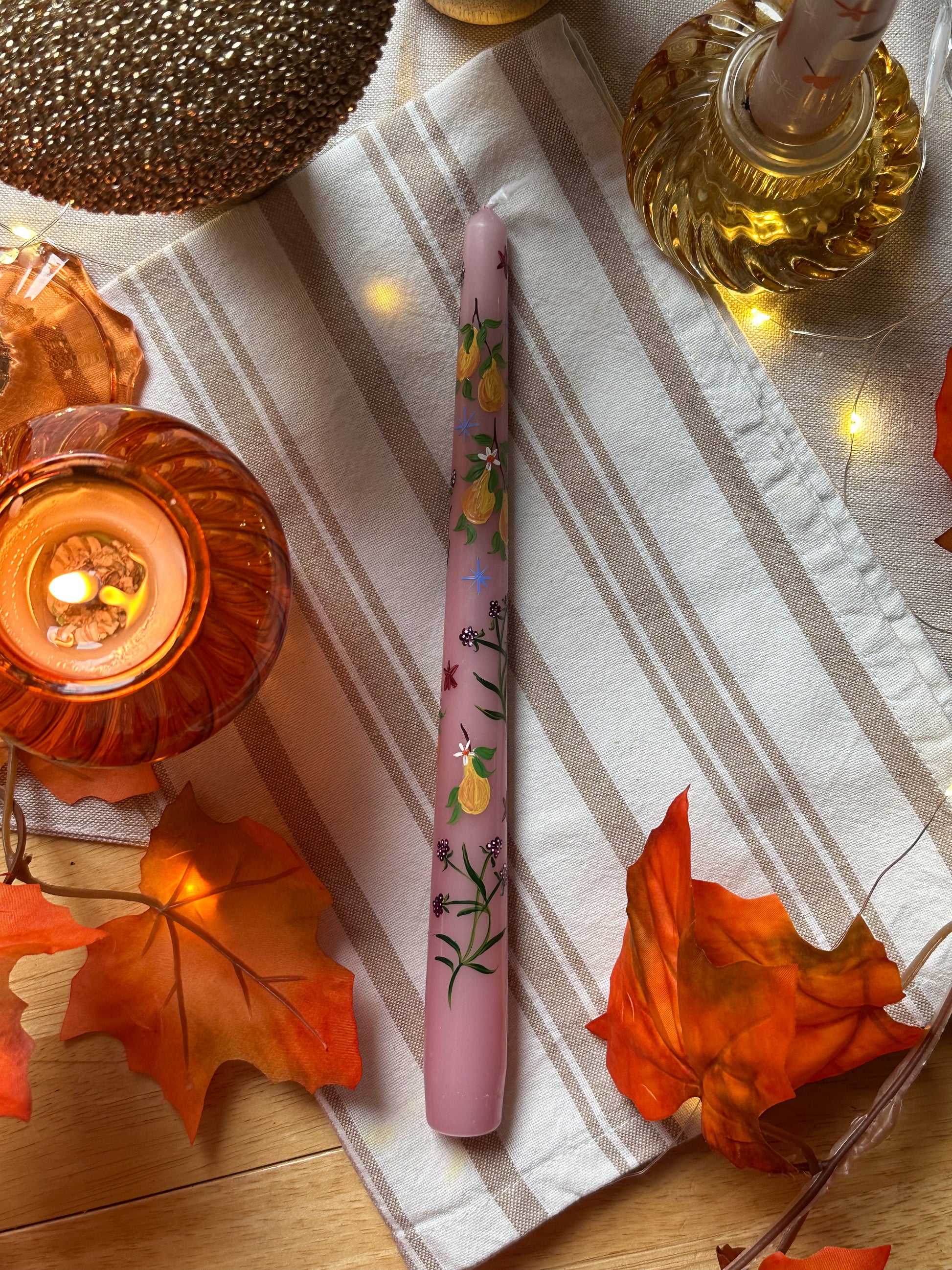 Hand Painted Pink Dinner Candle with illustrations of Pears, Berries and Autumnal Florals perfect for the cosy evenings.