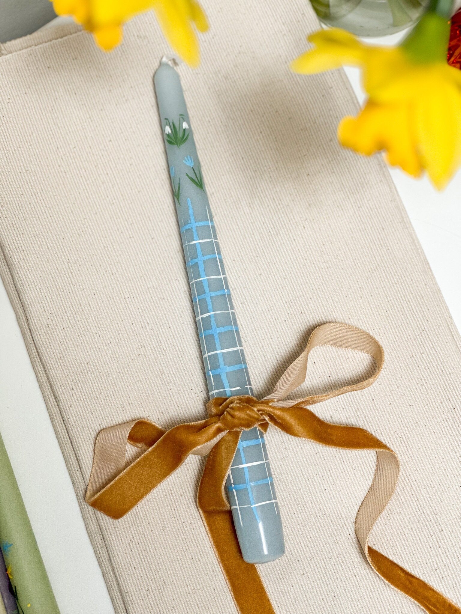 Hand - Painted Taper Candle, illustrated with spring inspired flowers and gingham pattern.