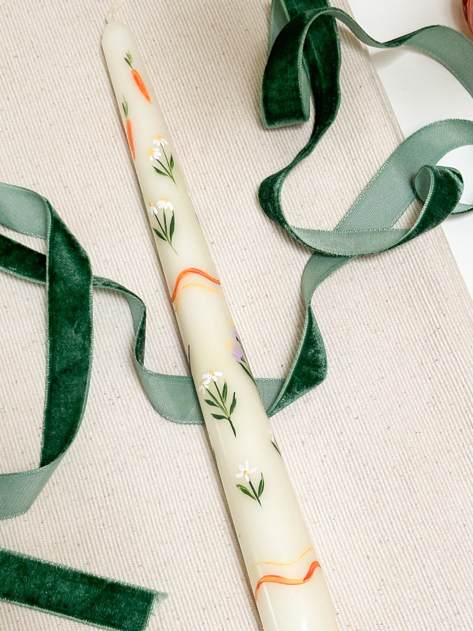 Hand - Painted Taper Candle, illustrated with spring inspired flowers and carrots.