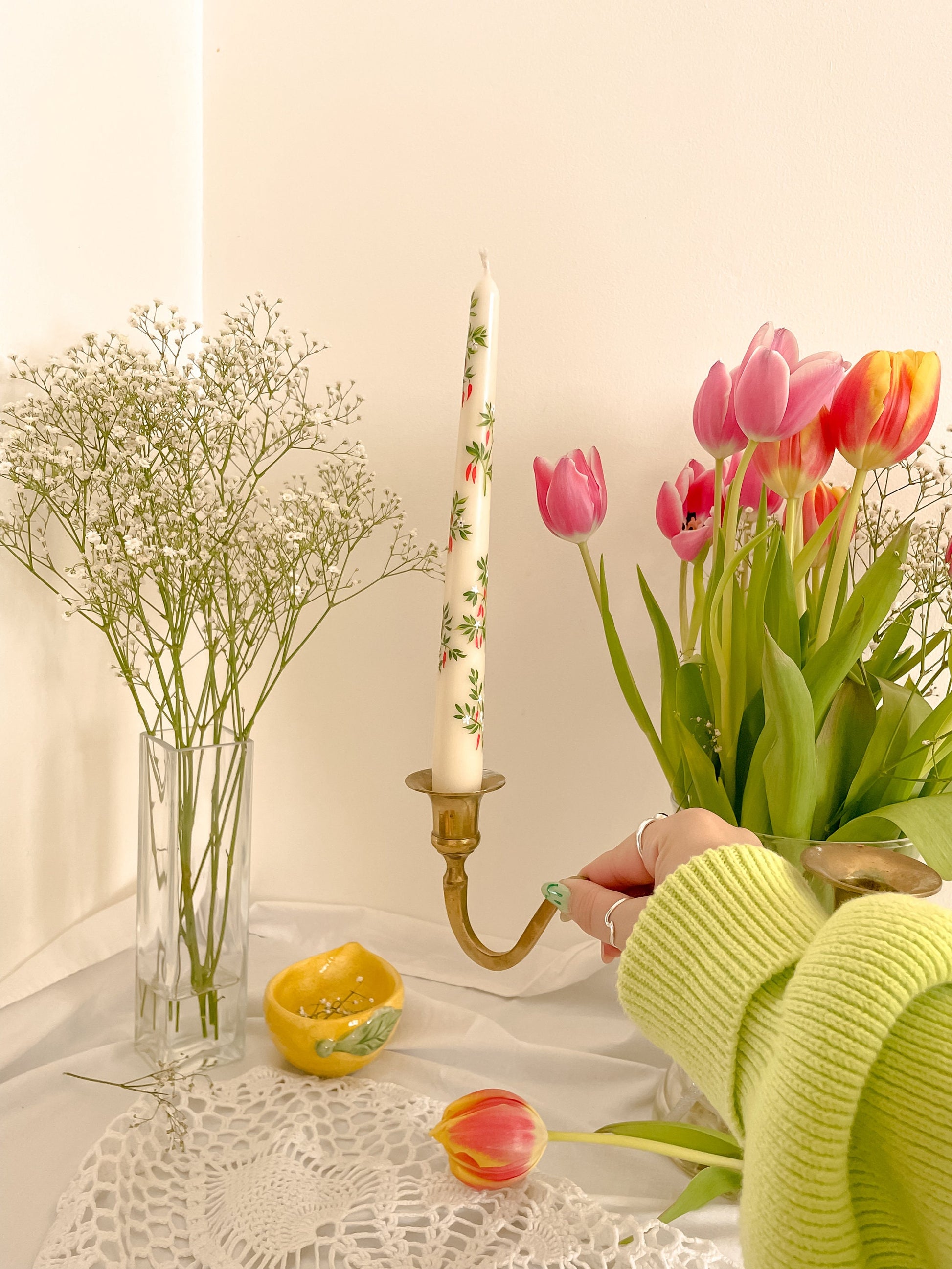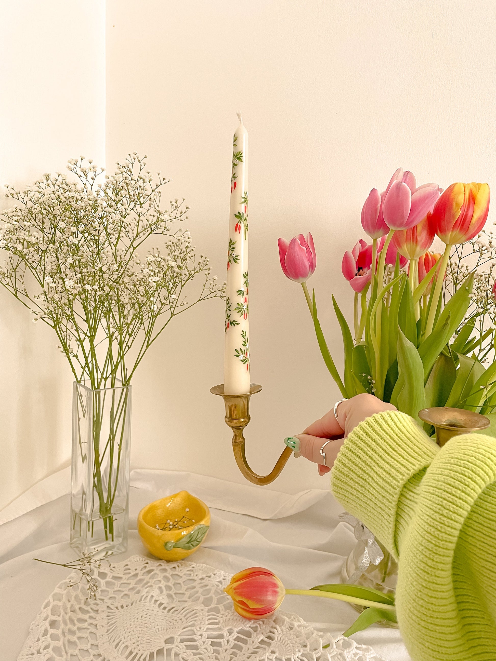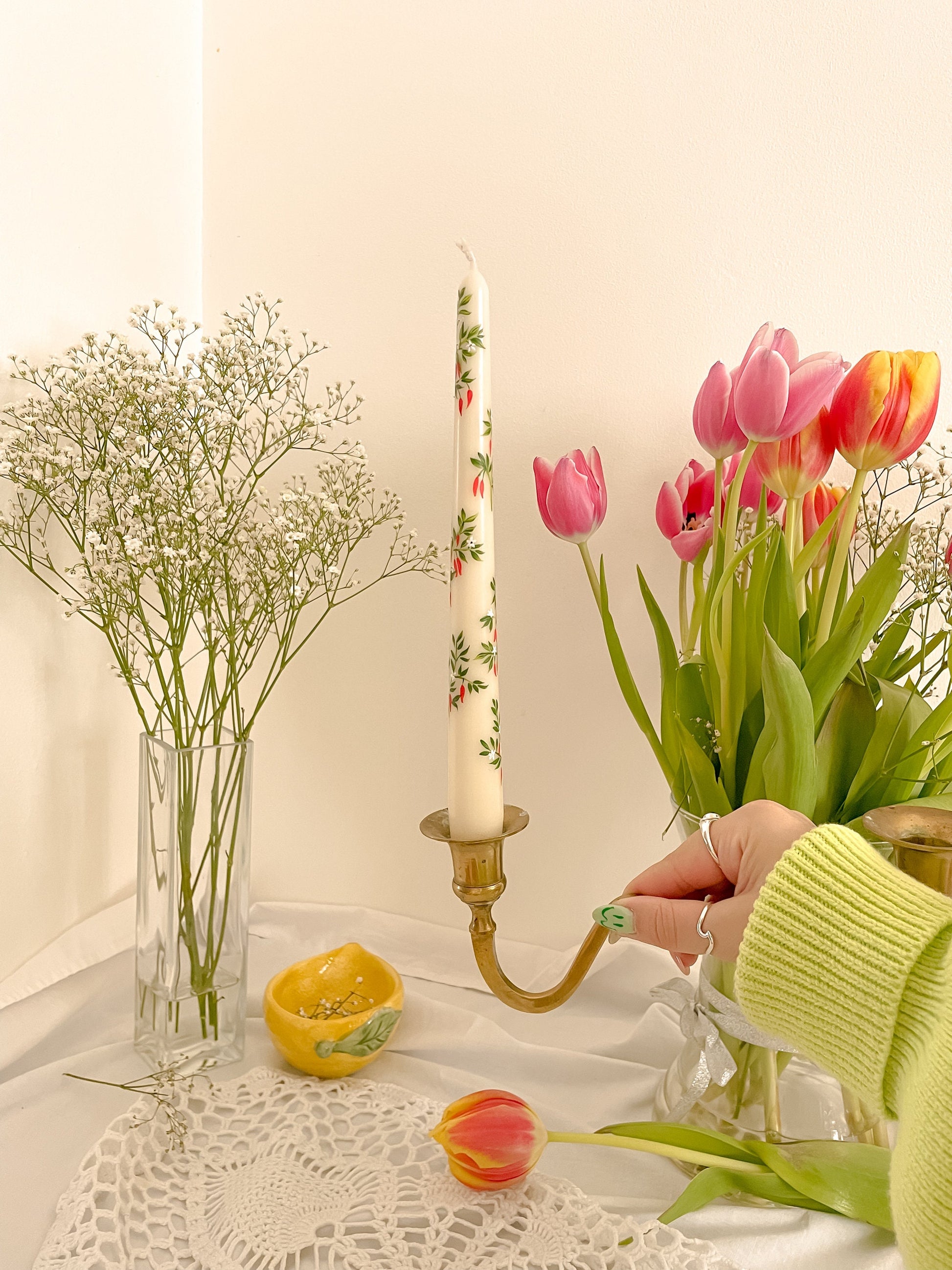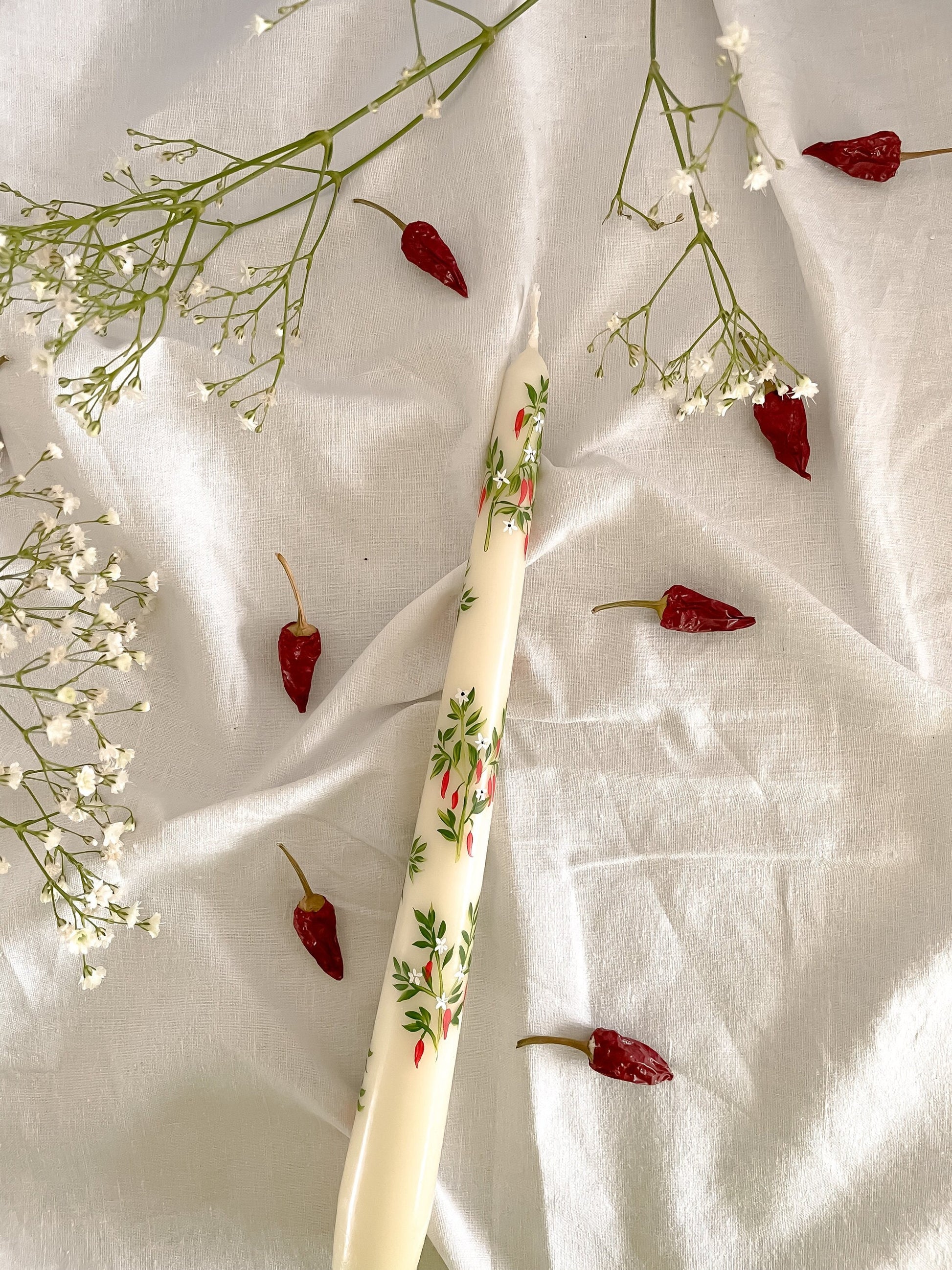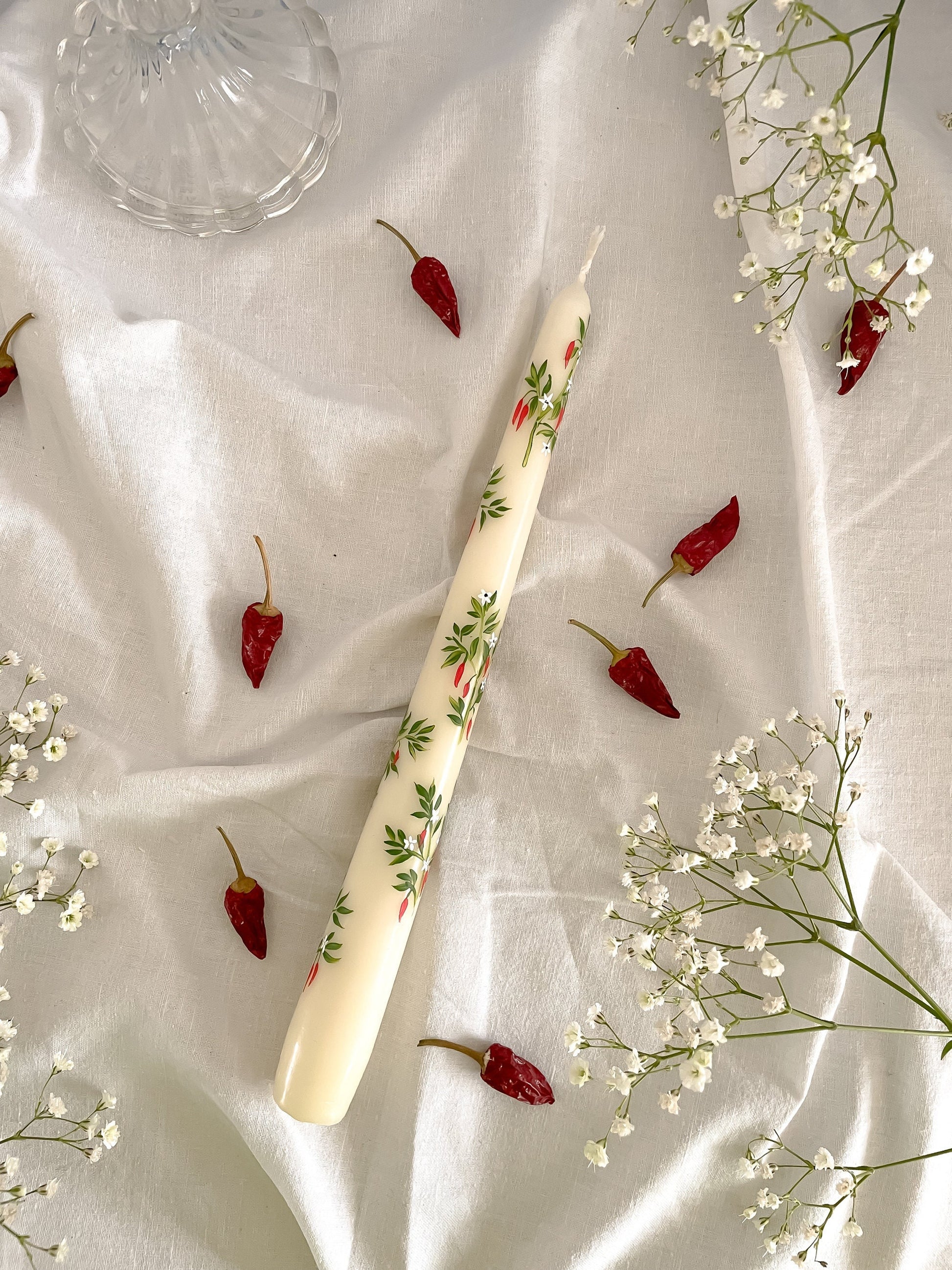 Hand - Painted Taper Candle, illustrated with chilly plants.