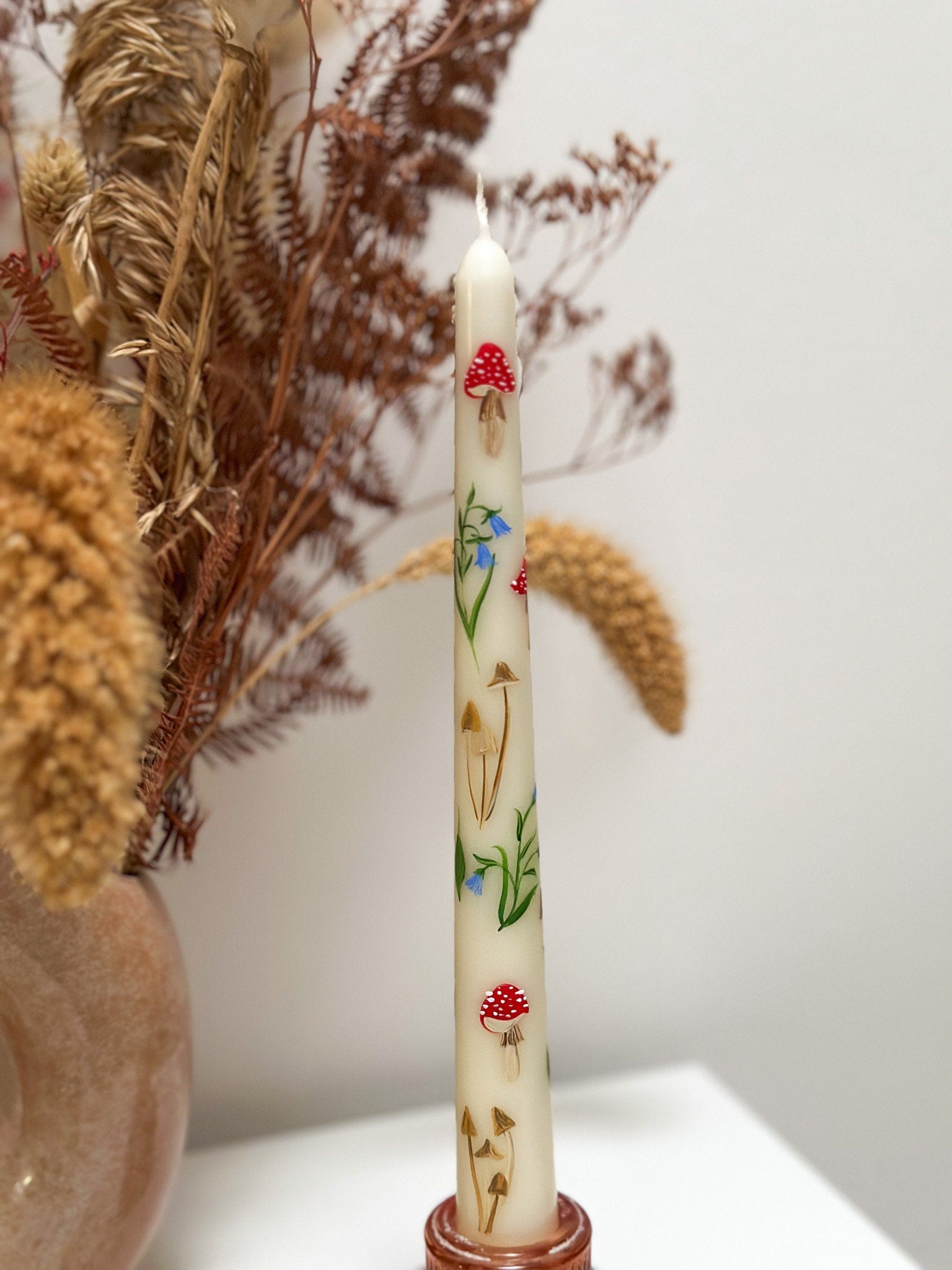 Hand - Painted Taper Candle, illustrated with wild flowers and mushrooms.