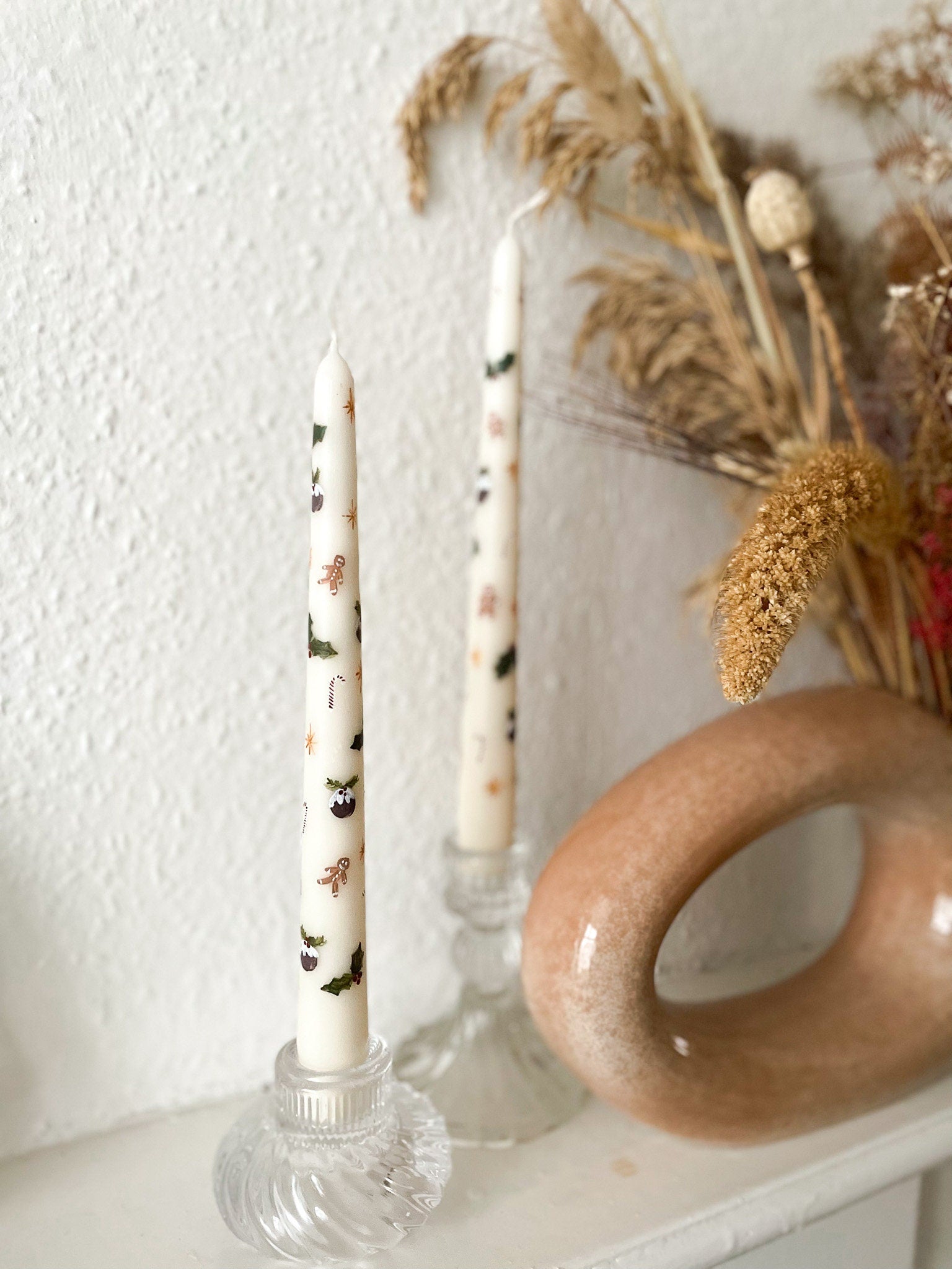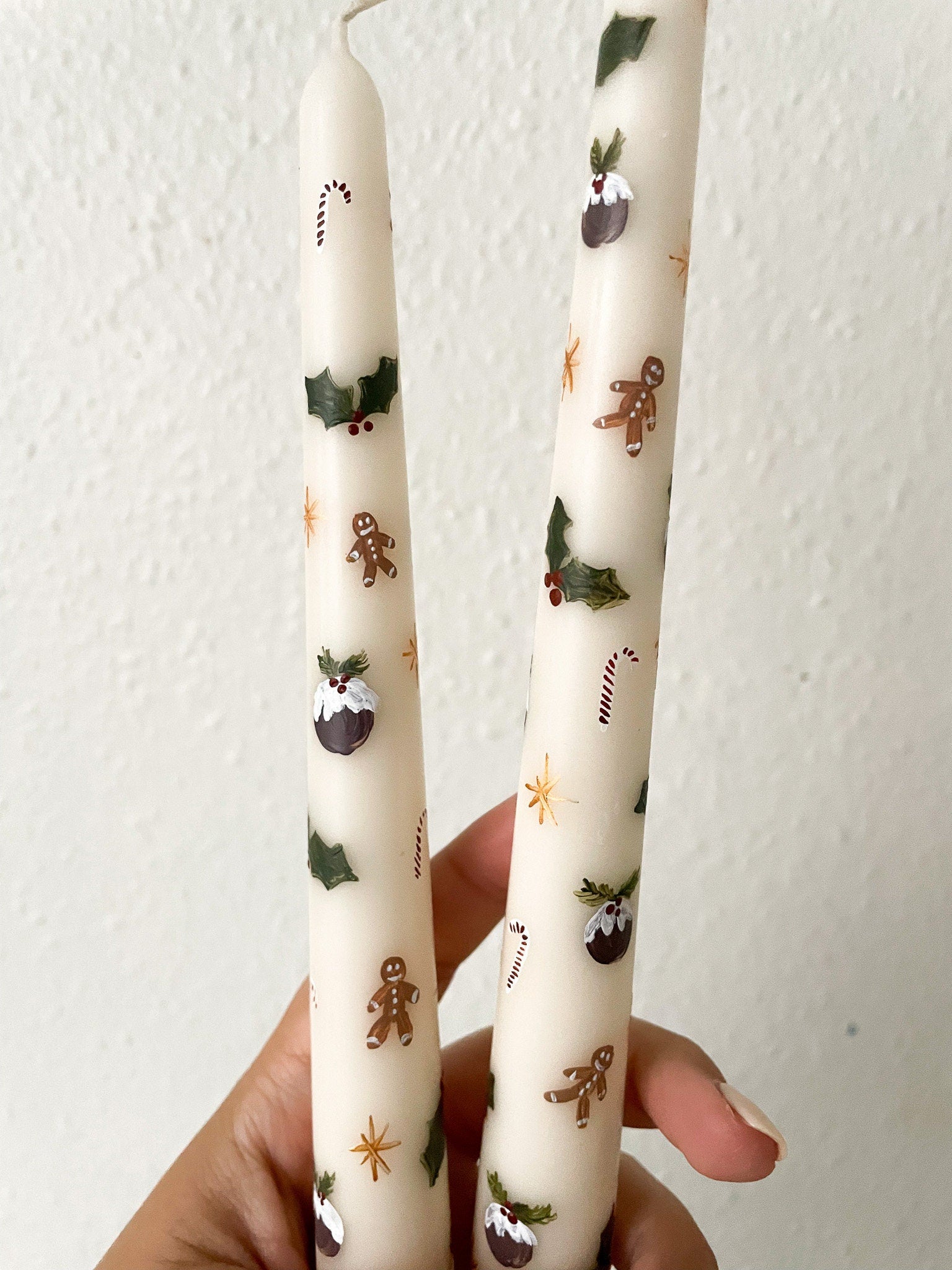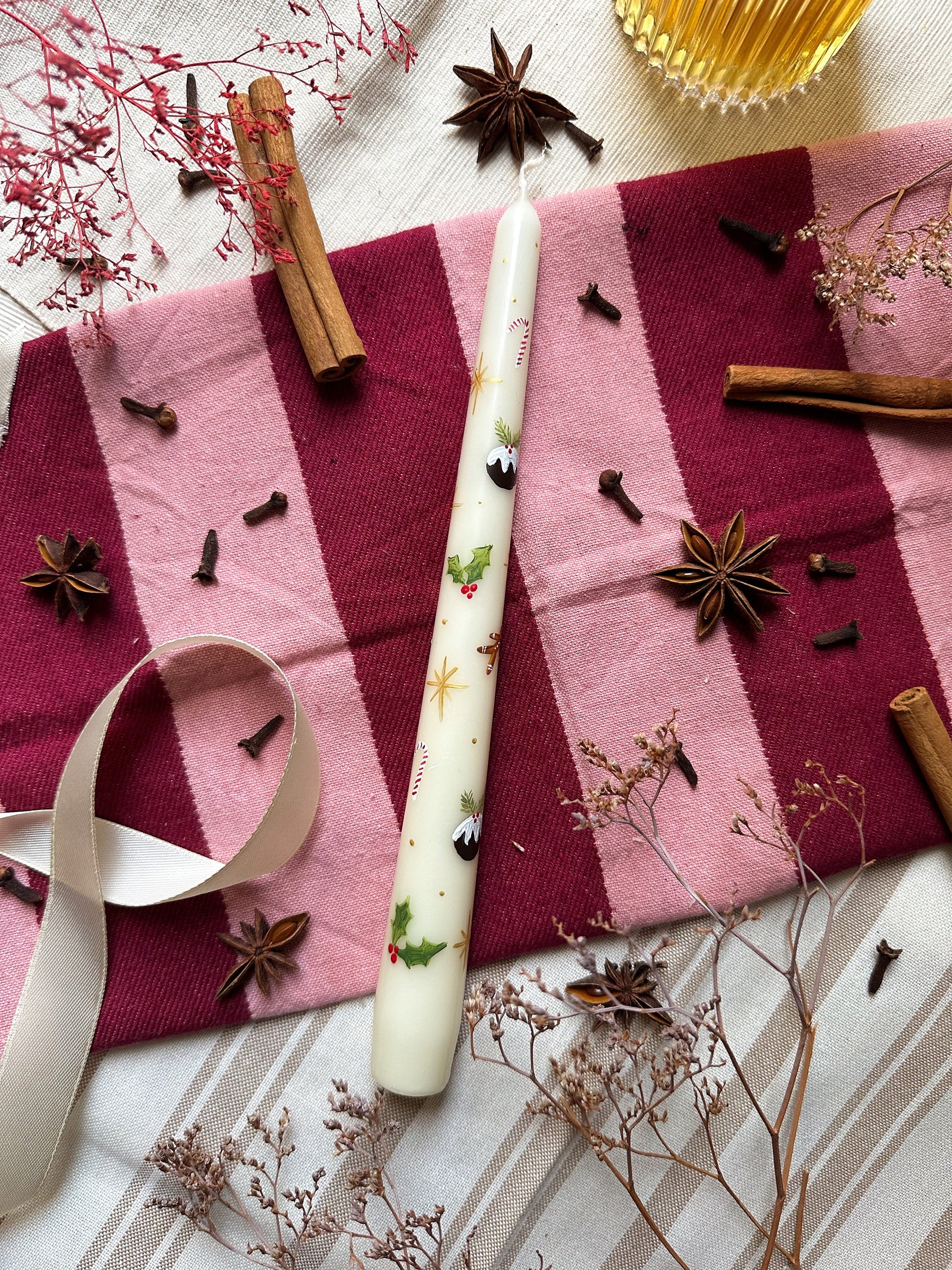 Hand - Painted Taper Candle, illustrated with Christmas Favourite ornaments - Candy Cane, Gingerbread Man cookies, Christmas Pudding.