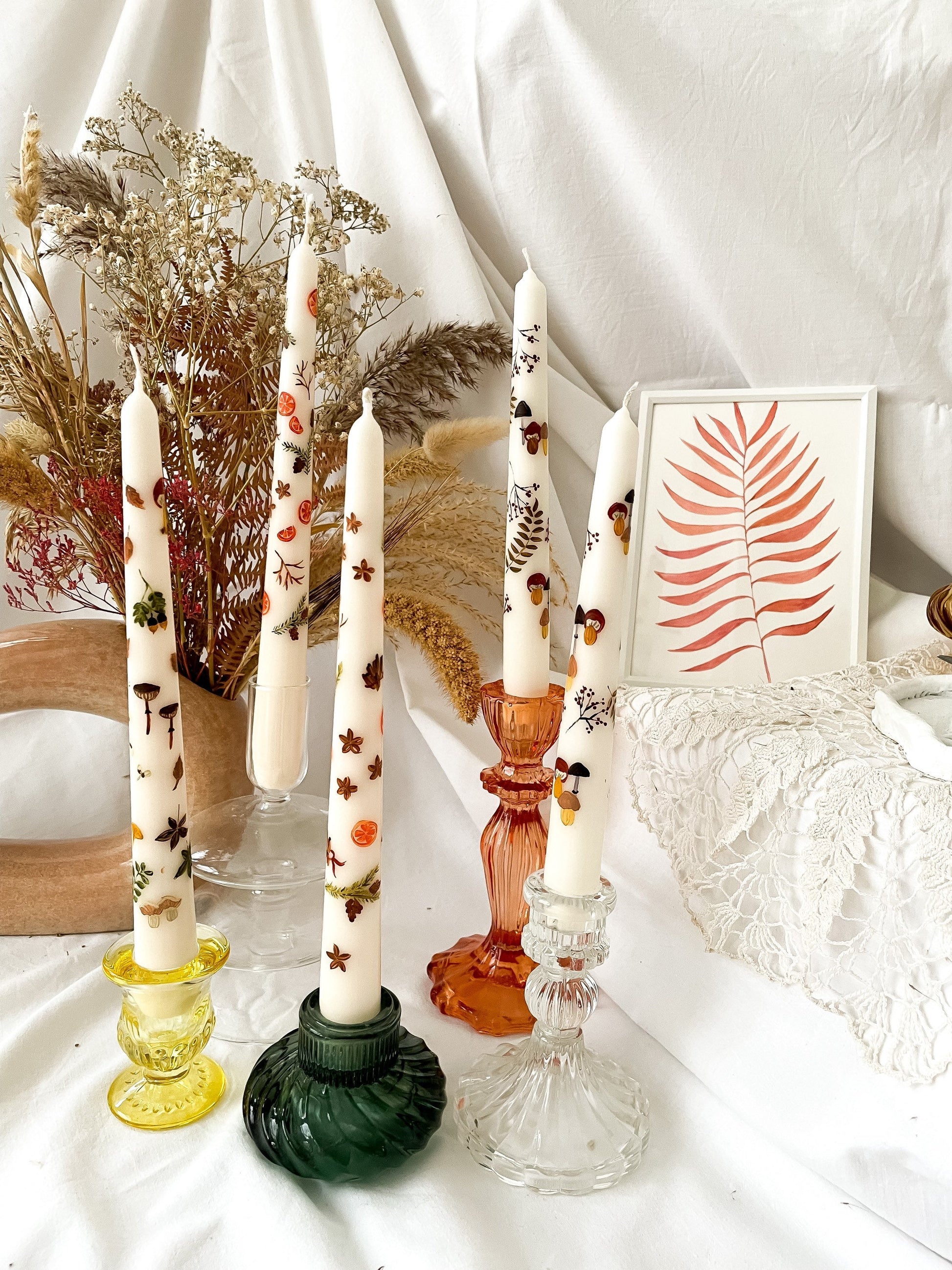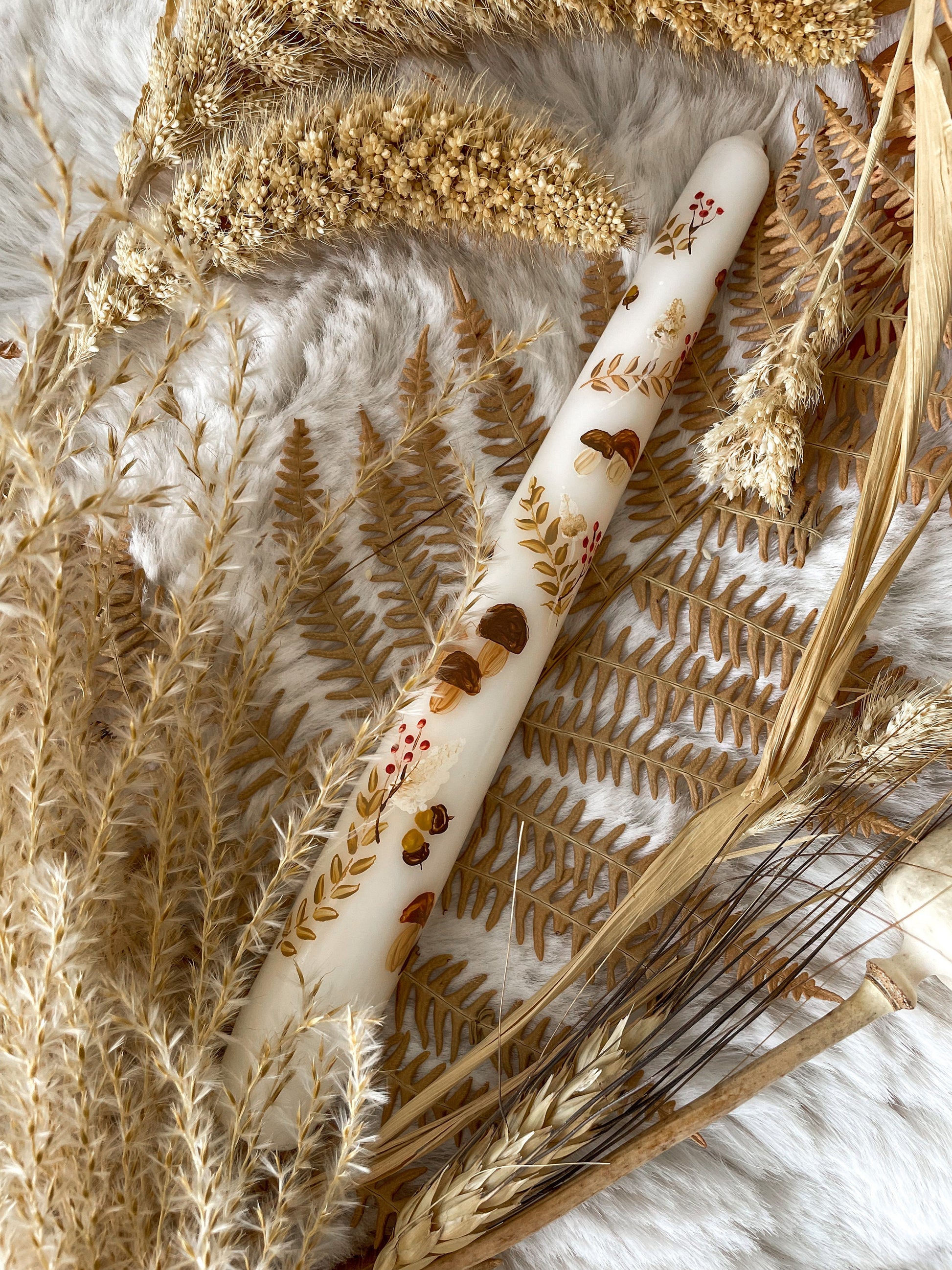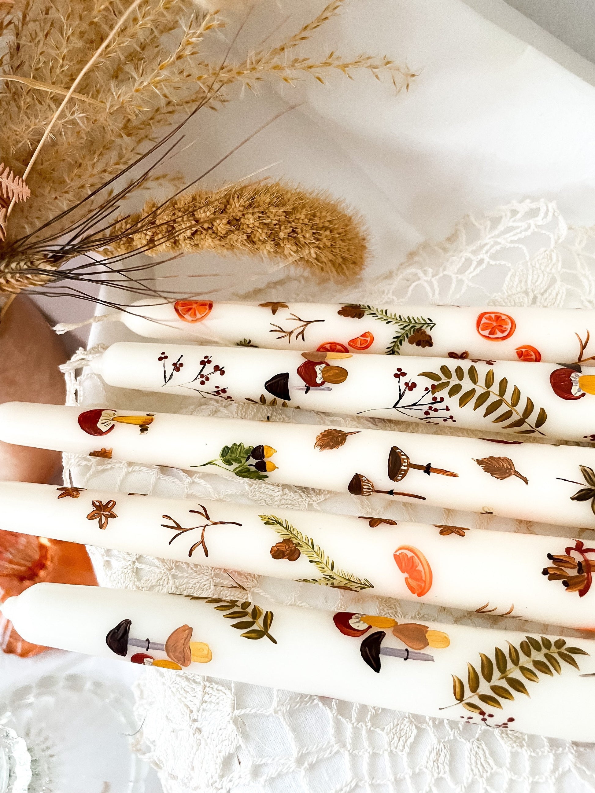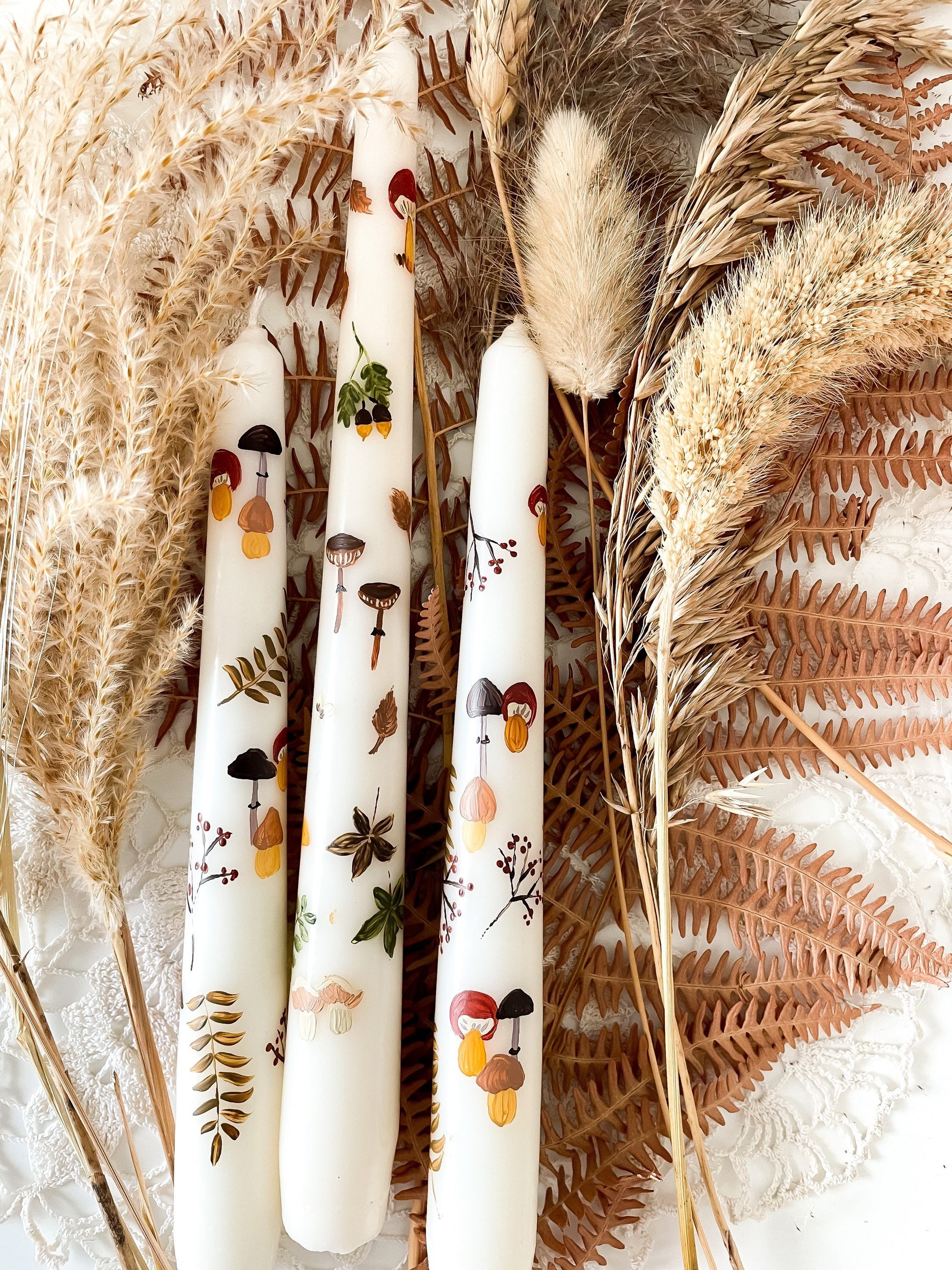Hand - Painted Taper Candle, illustrated with autumn fungi and autumn leaves.