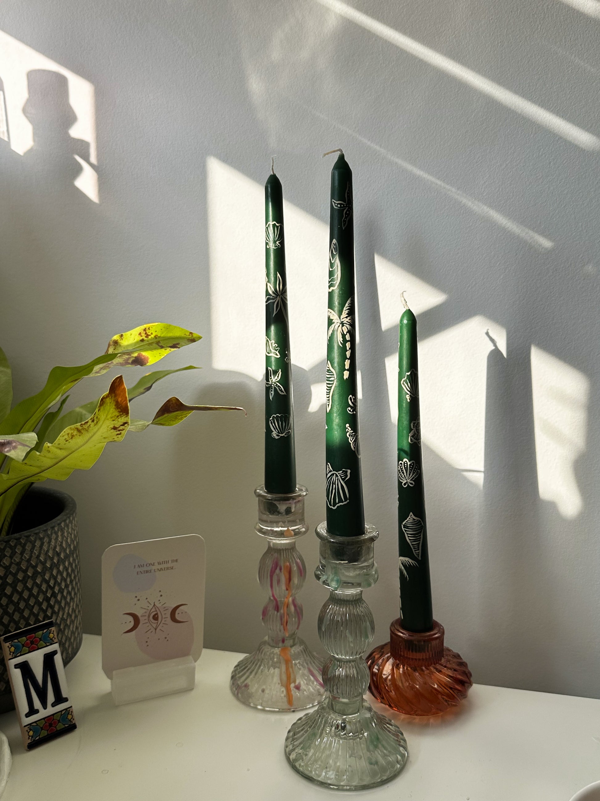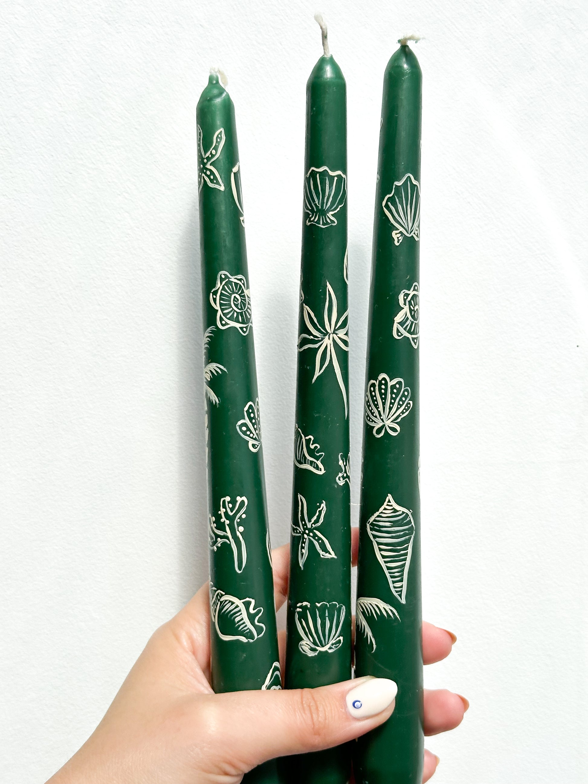 Hand - Painted Taper Candle, illustrated with seashells & palms. Inspired by the seaside. Perfect for a beach wedding or your summer table scapes.