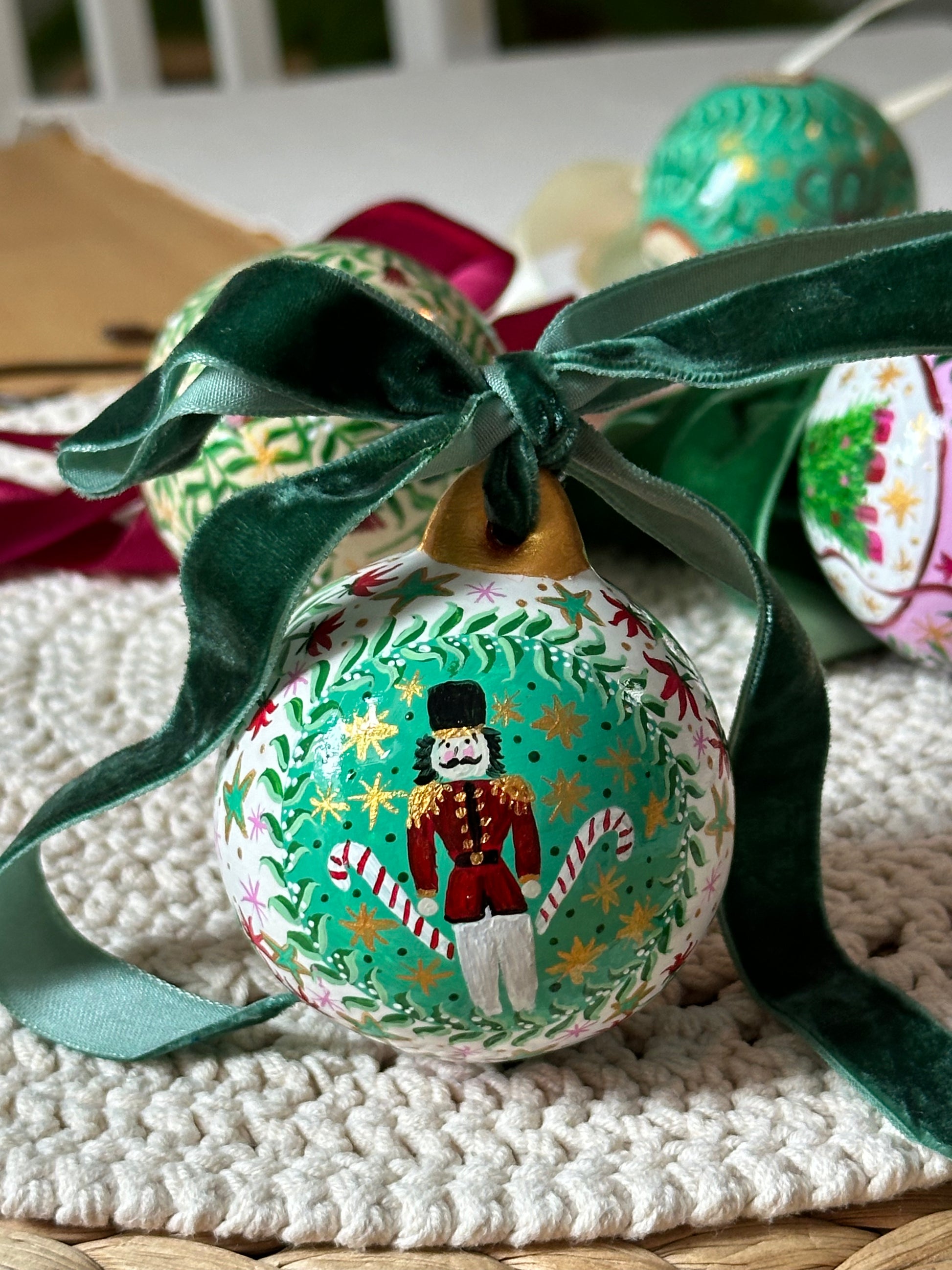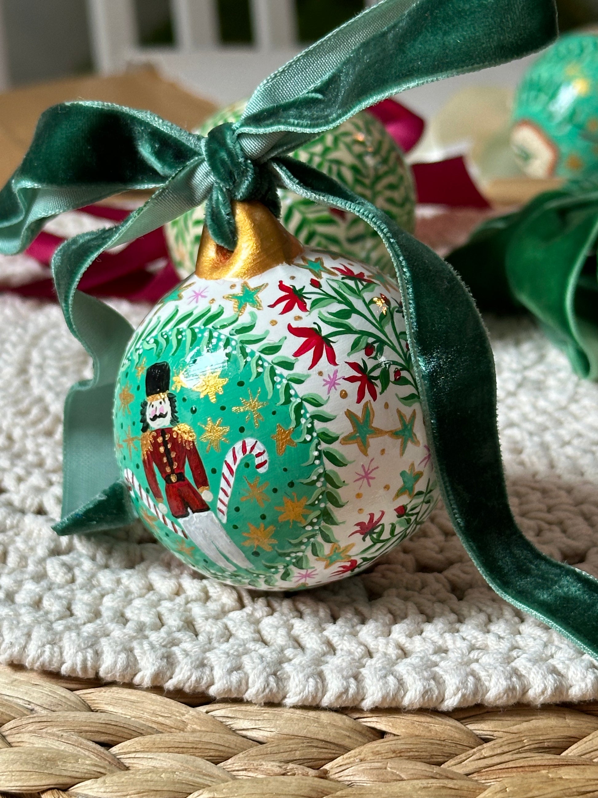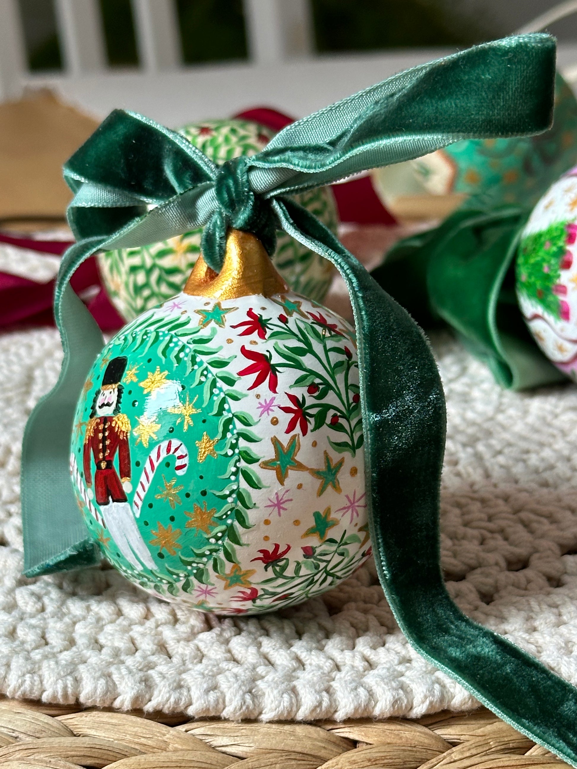 One of a kind hand painted, traditional Christmas Bauble. This Luxurious one of a kind bauble is the perfect Christmas gift and a keepsake. Hand painted with festive florals, beautiful details, candy canes and a Nutcracker.