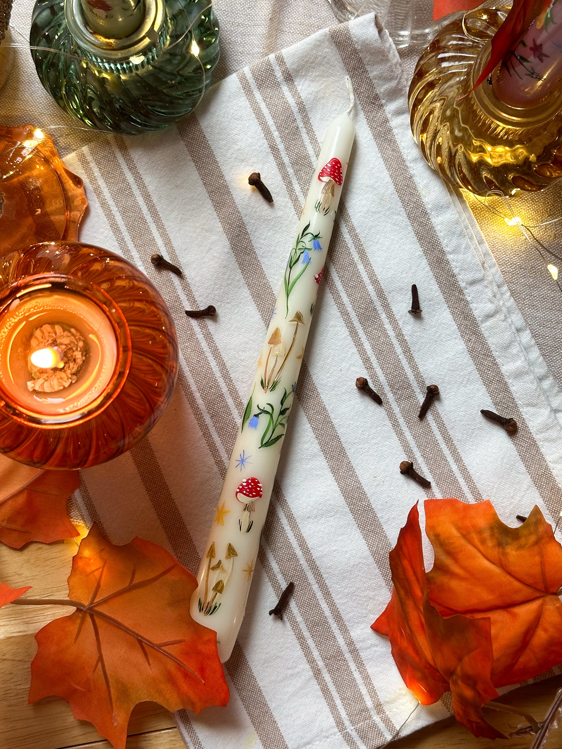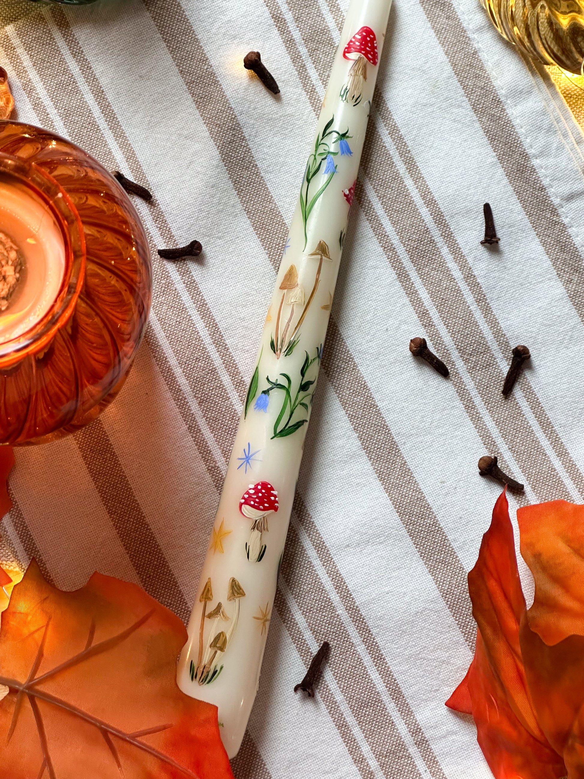Ivory Taper Dinner Candle, Hand Painted with mushrooms, autumnal florals and berries.