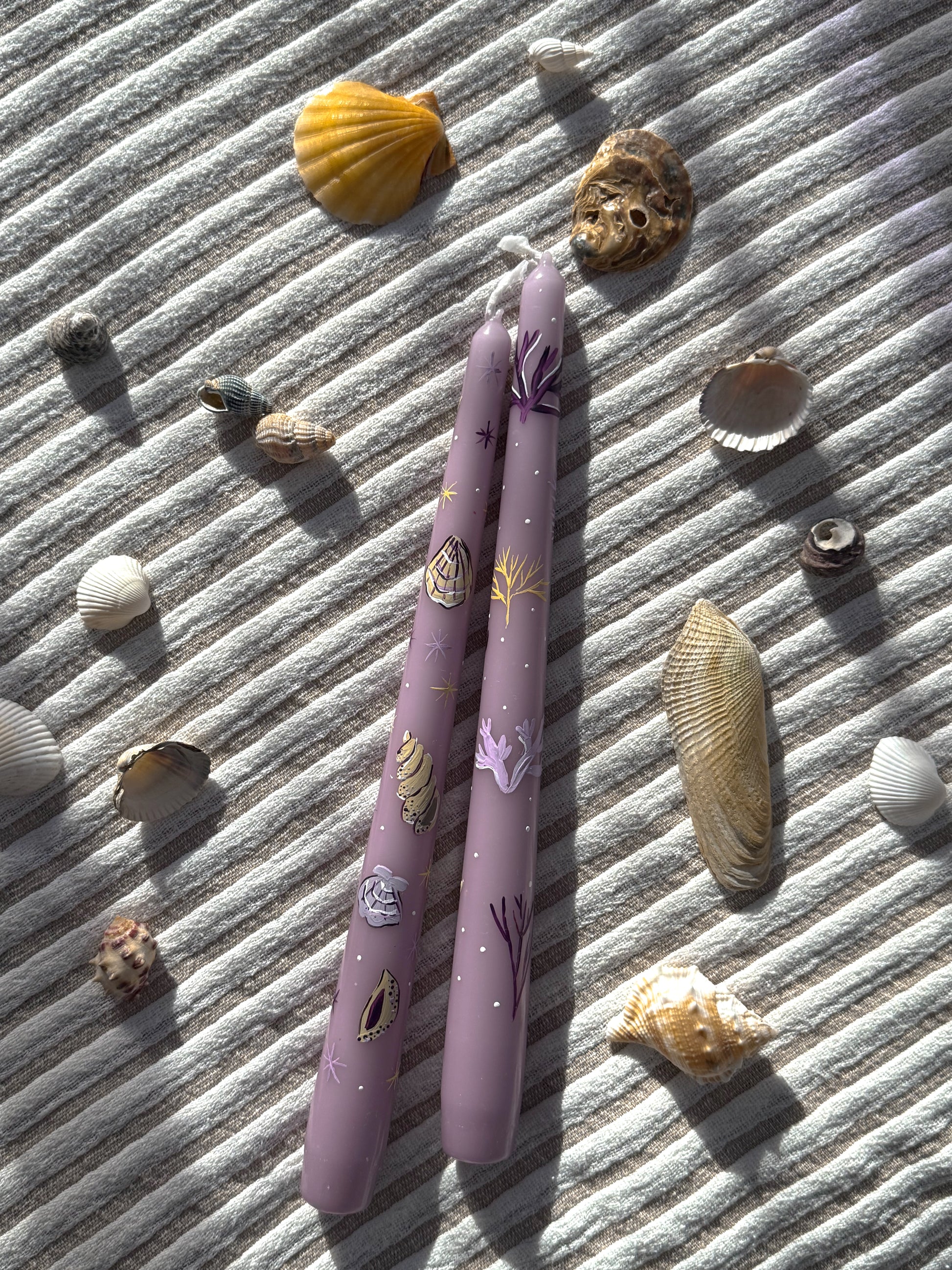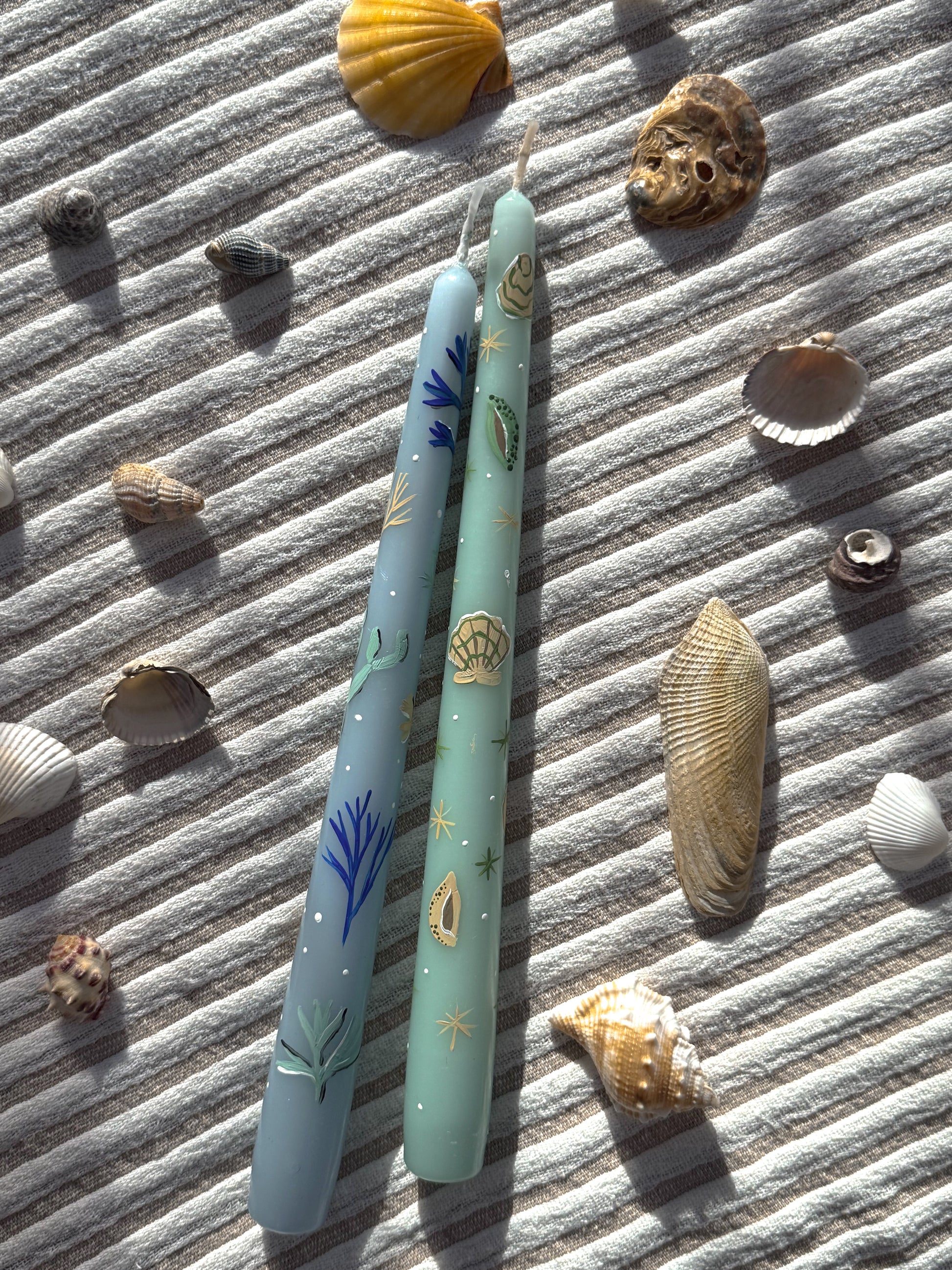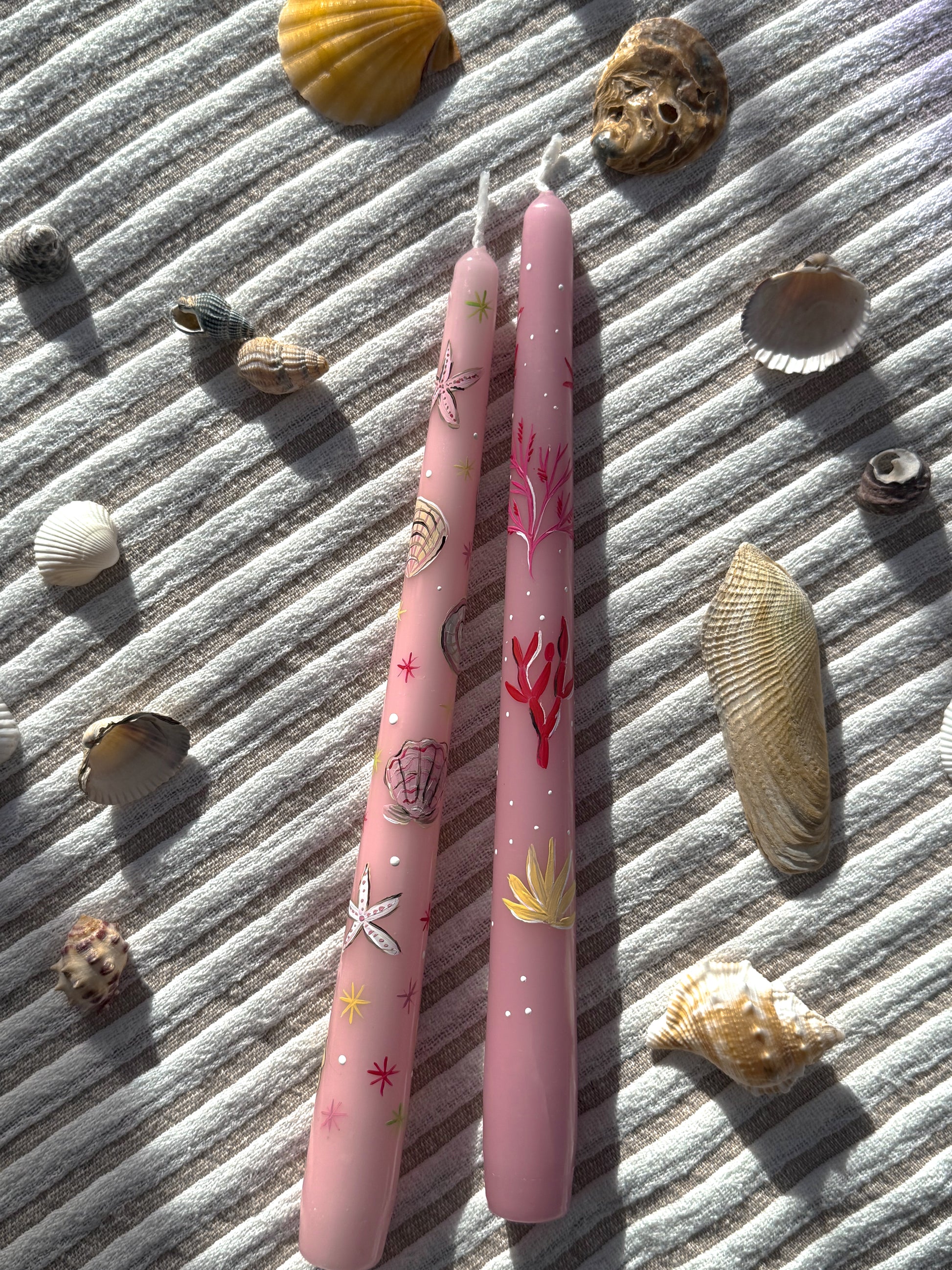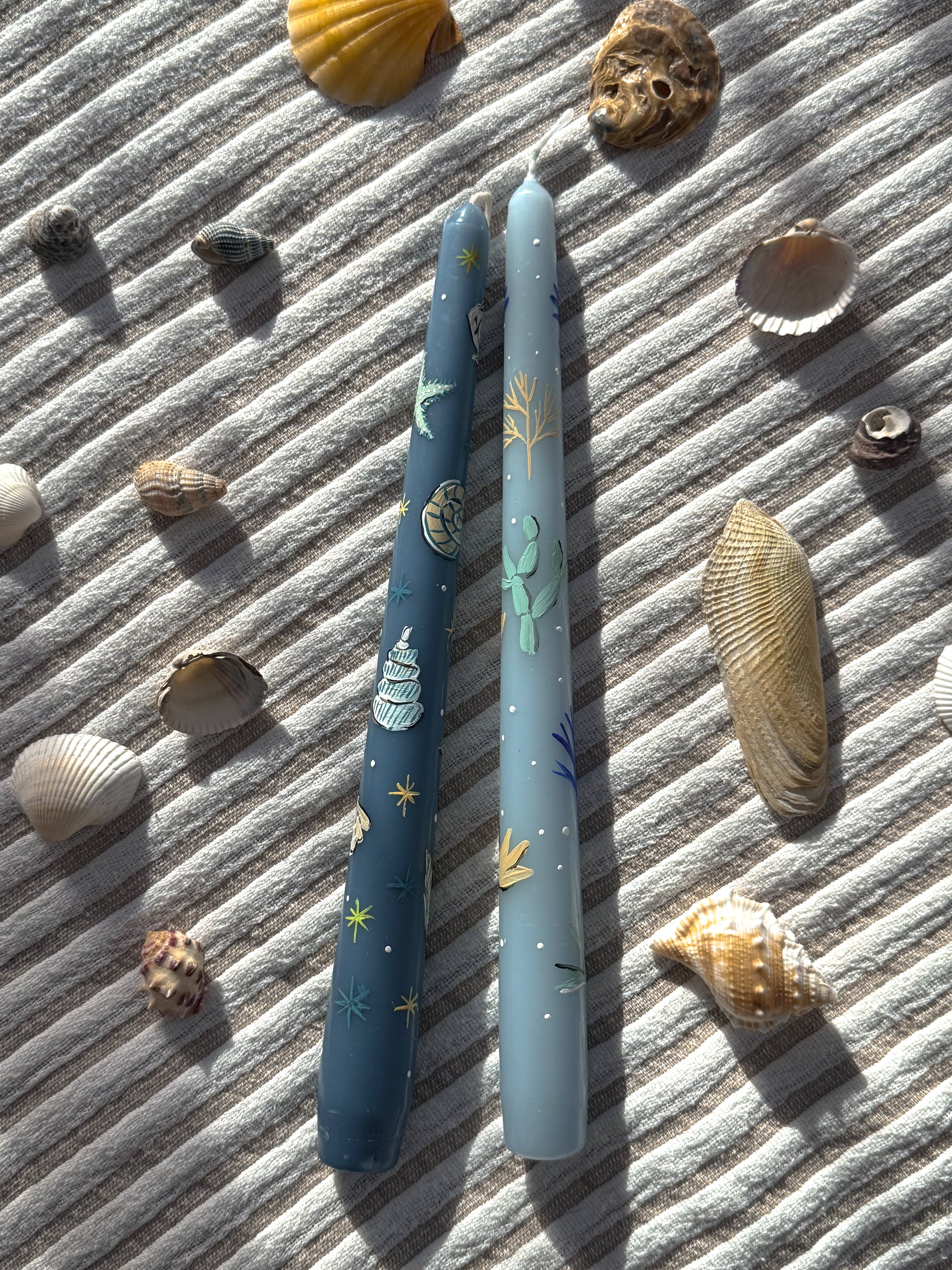 Bring a touch of the seaside to your home with these beautifully hand-painted taper candles, part of the exclusive Coastal Collection by Ancheva Designs. Each candle is individually adorned with delicate marine illustrations—from coral and seaweed to starfish and shells—capturing the magic of the ocean in intricate detail.