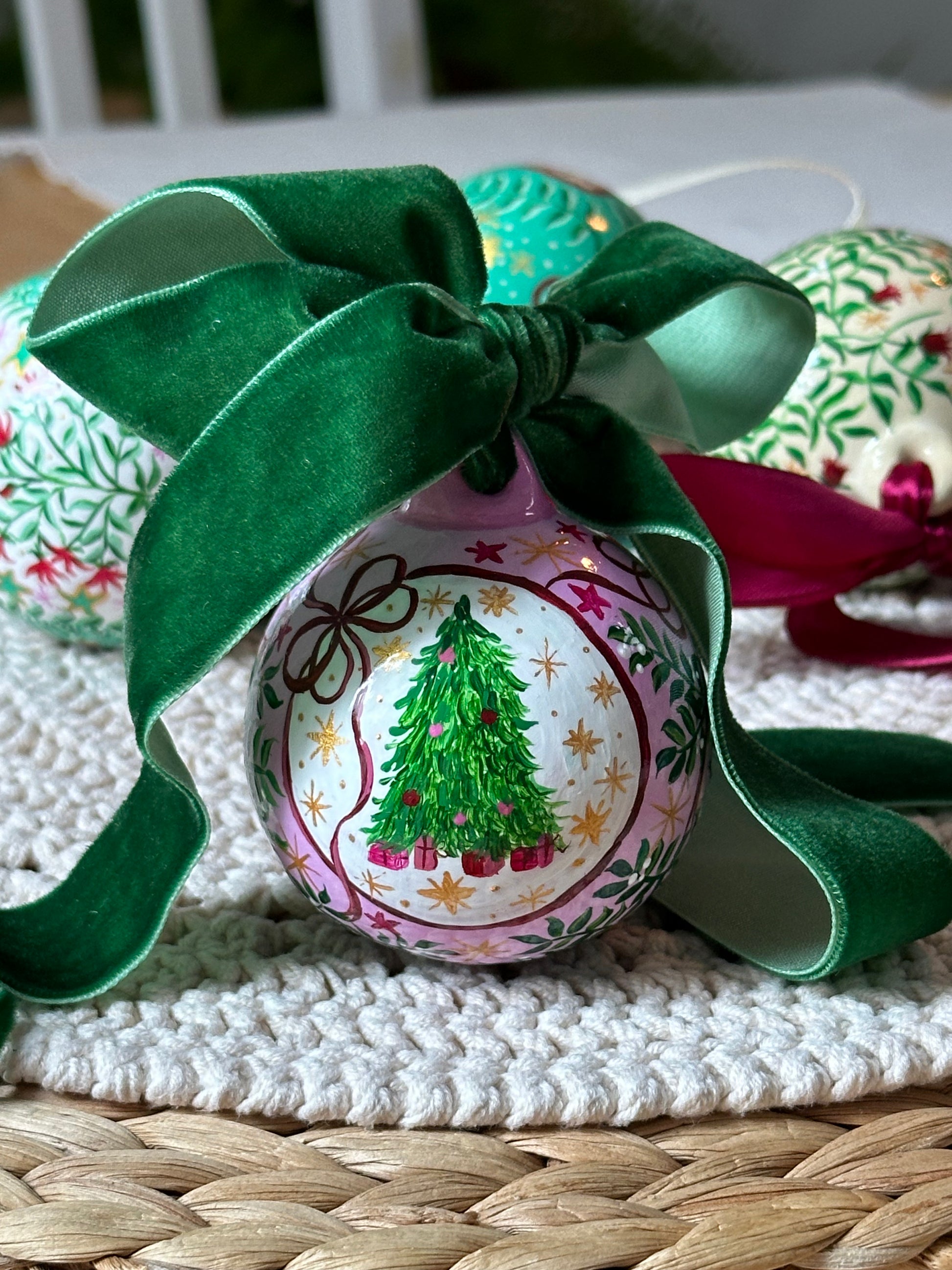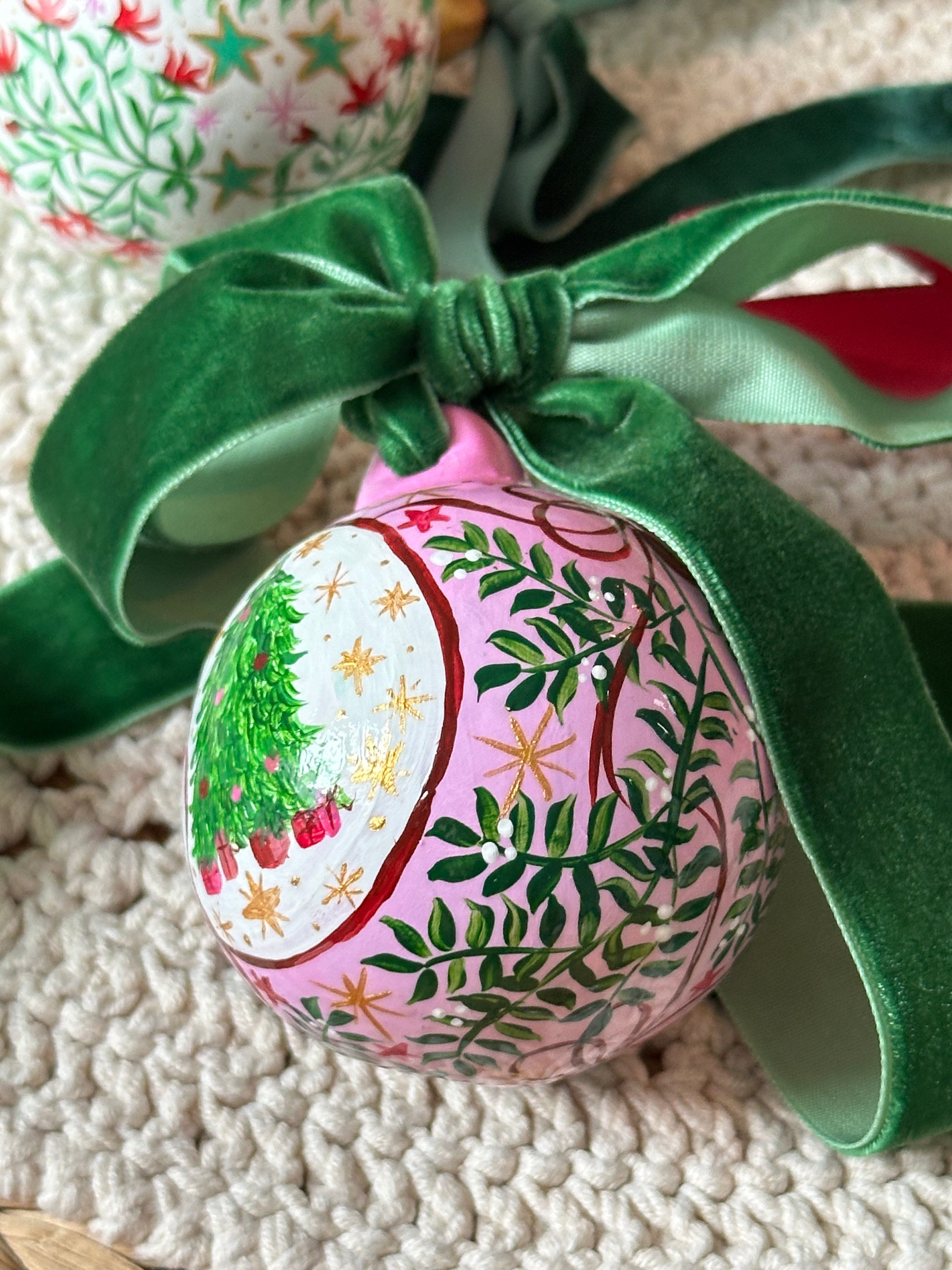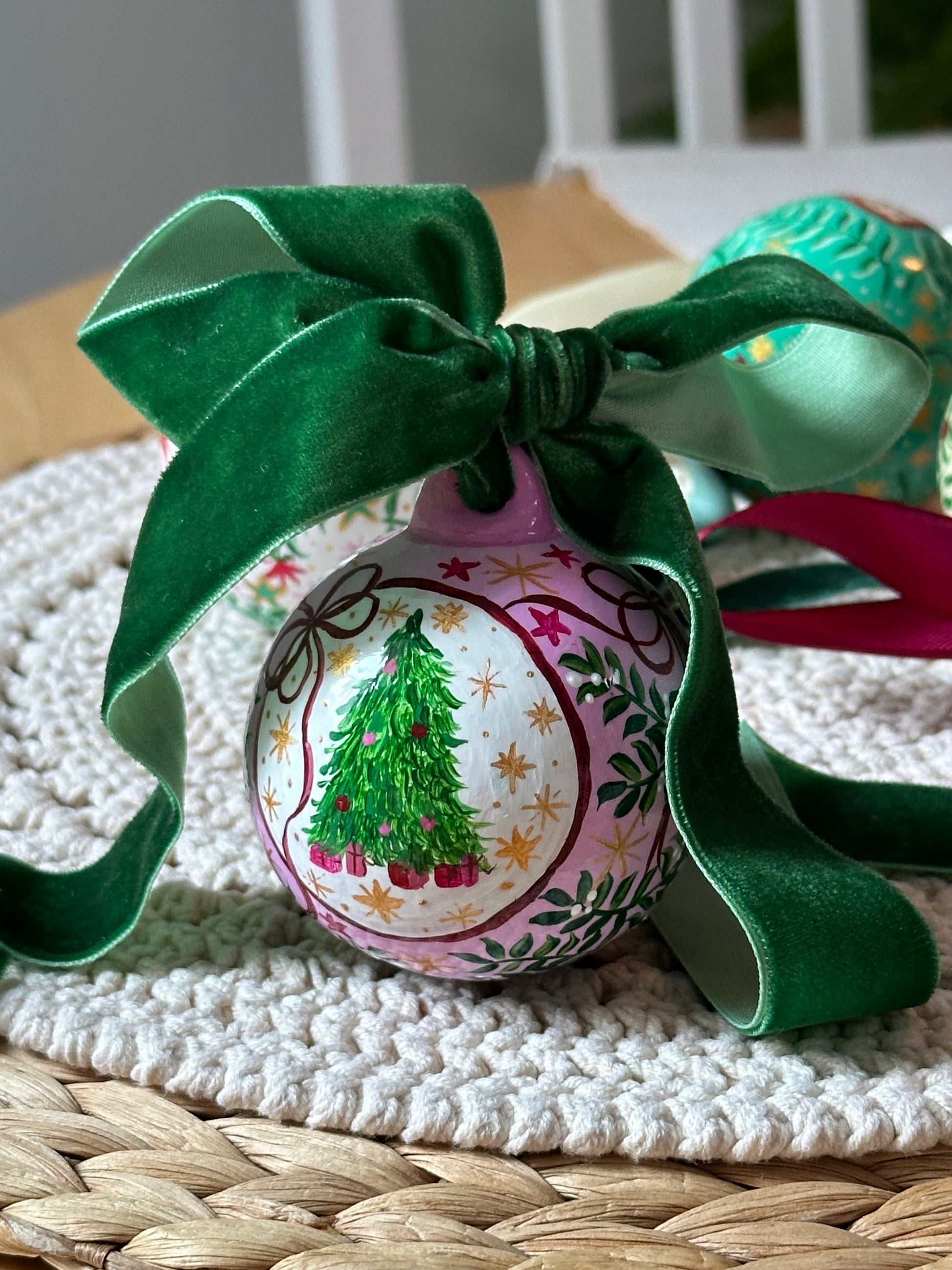 One of a kind hand painted, traditional Christmas Bauble. This Luxurious one of a kind bauble is the perfect Christmas gift and a keepsake. Hand painted with festive florals, beautiful details, Christmas tree and bows.