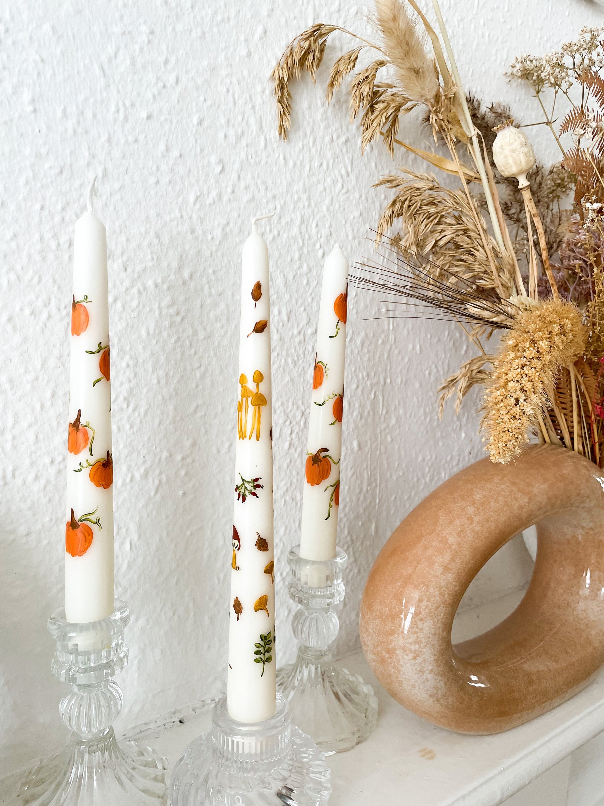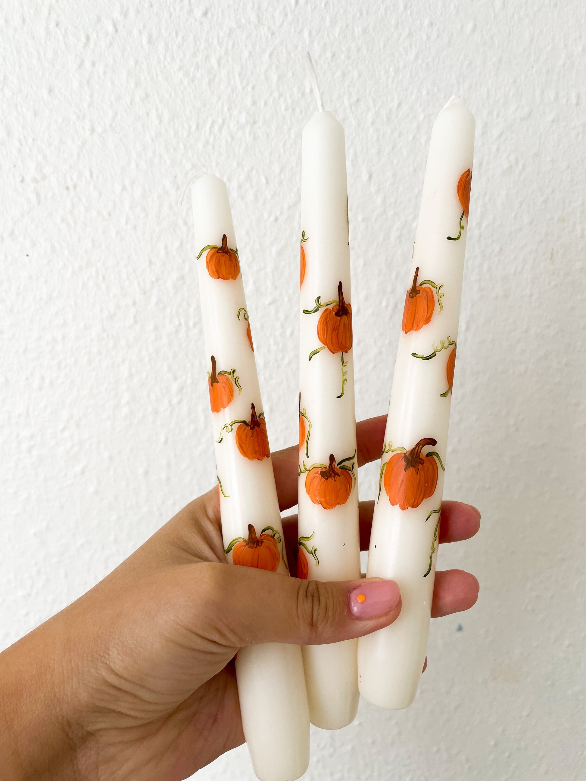 Hand - Painted Taper Candle, illustrated with gorgeous pumpkins.