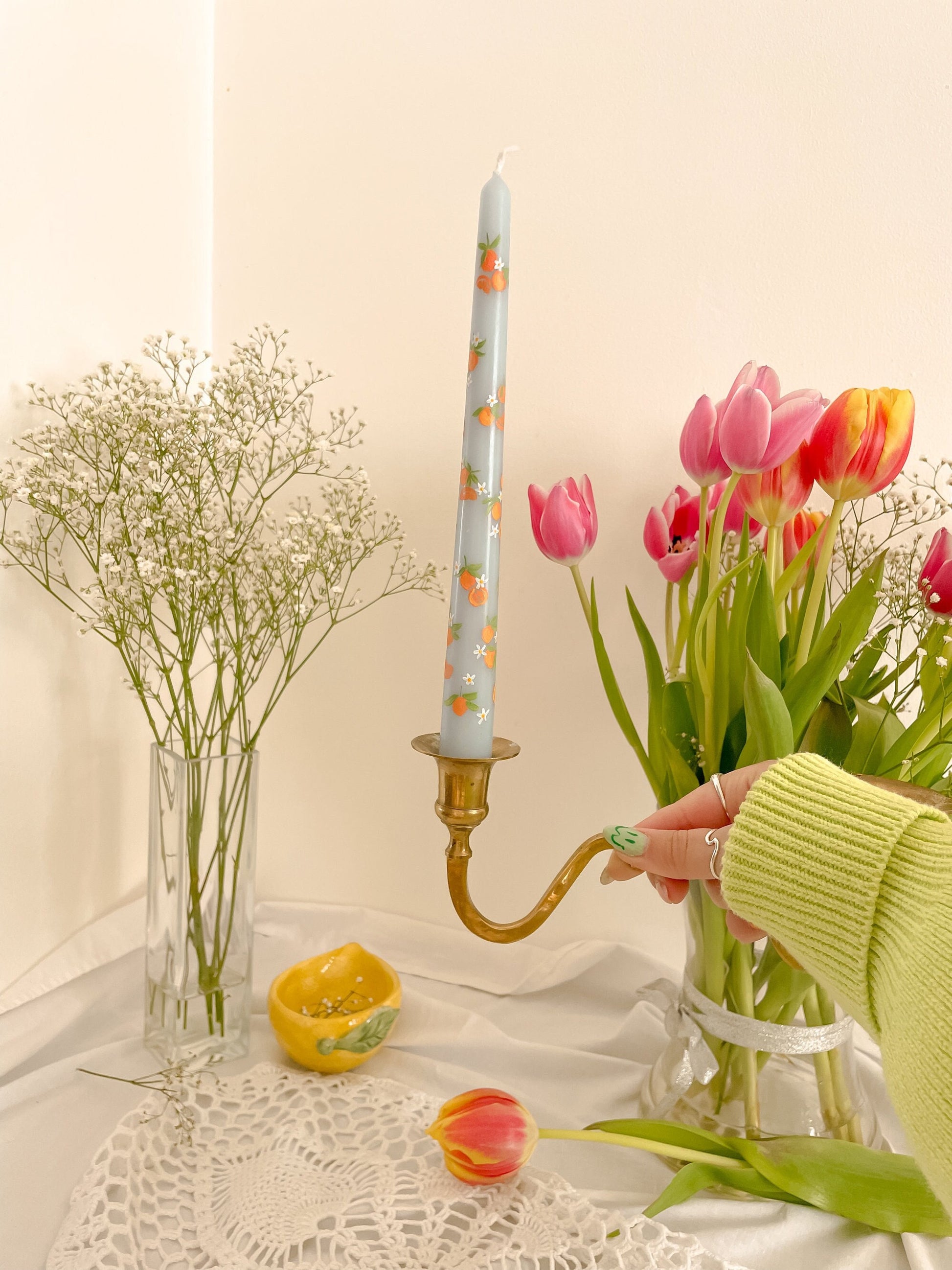 Hand - Painted Taper Candle, illustrated with orange blooms.