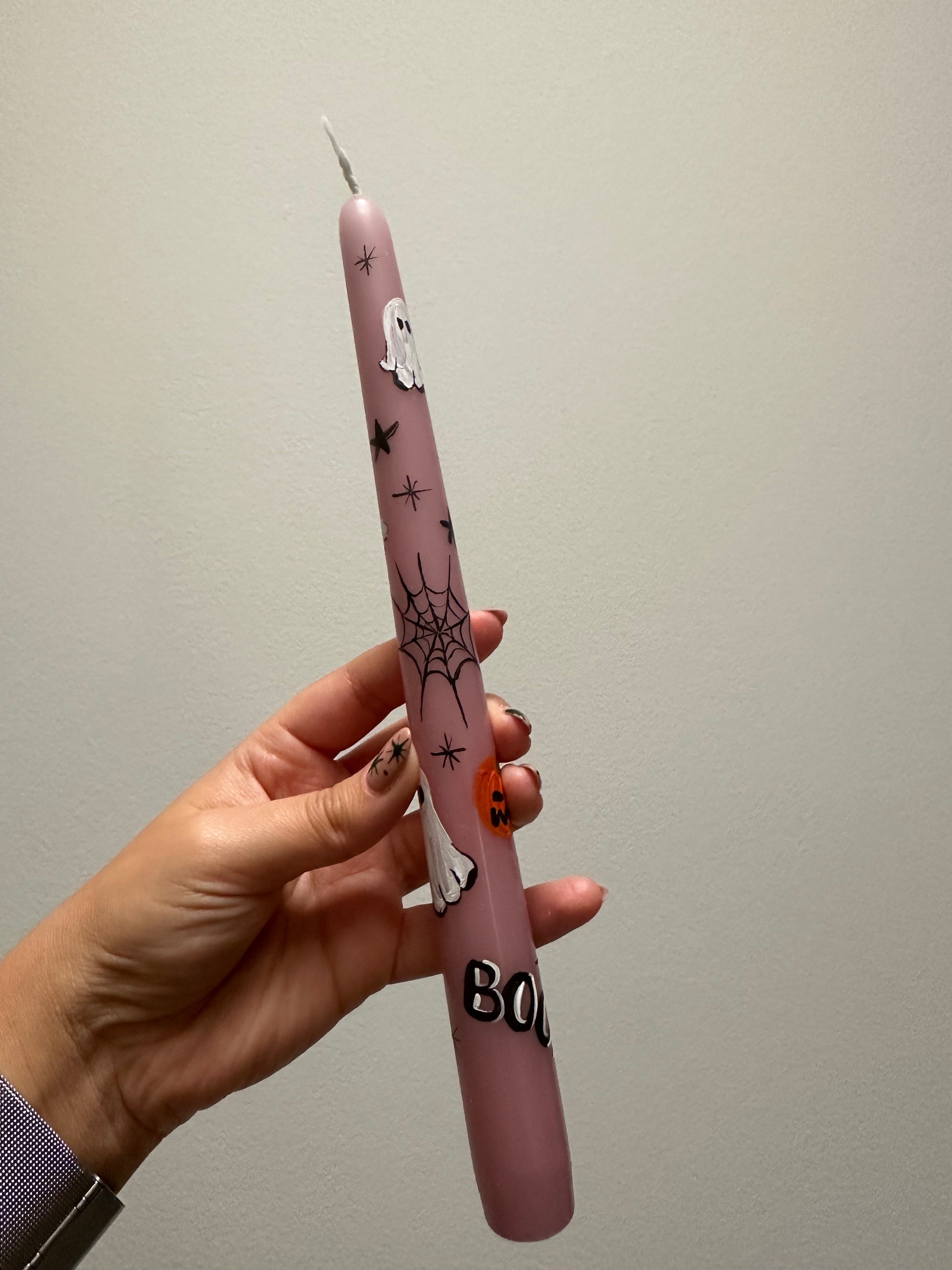 Infuse your home with a modern twist on classic Halloween charm. This unique taper candle is meticulously hand-painted with a whimsical ghost, intricate spiderwebs, and celestial stars. Its muted lavender-pink hue offers a sophisticated backdrop for the striking design. Ideal for creating a captivating center piece or as a standalone piece of art to celebrate the spooky season.