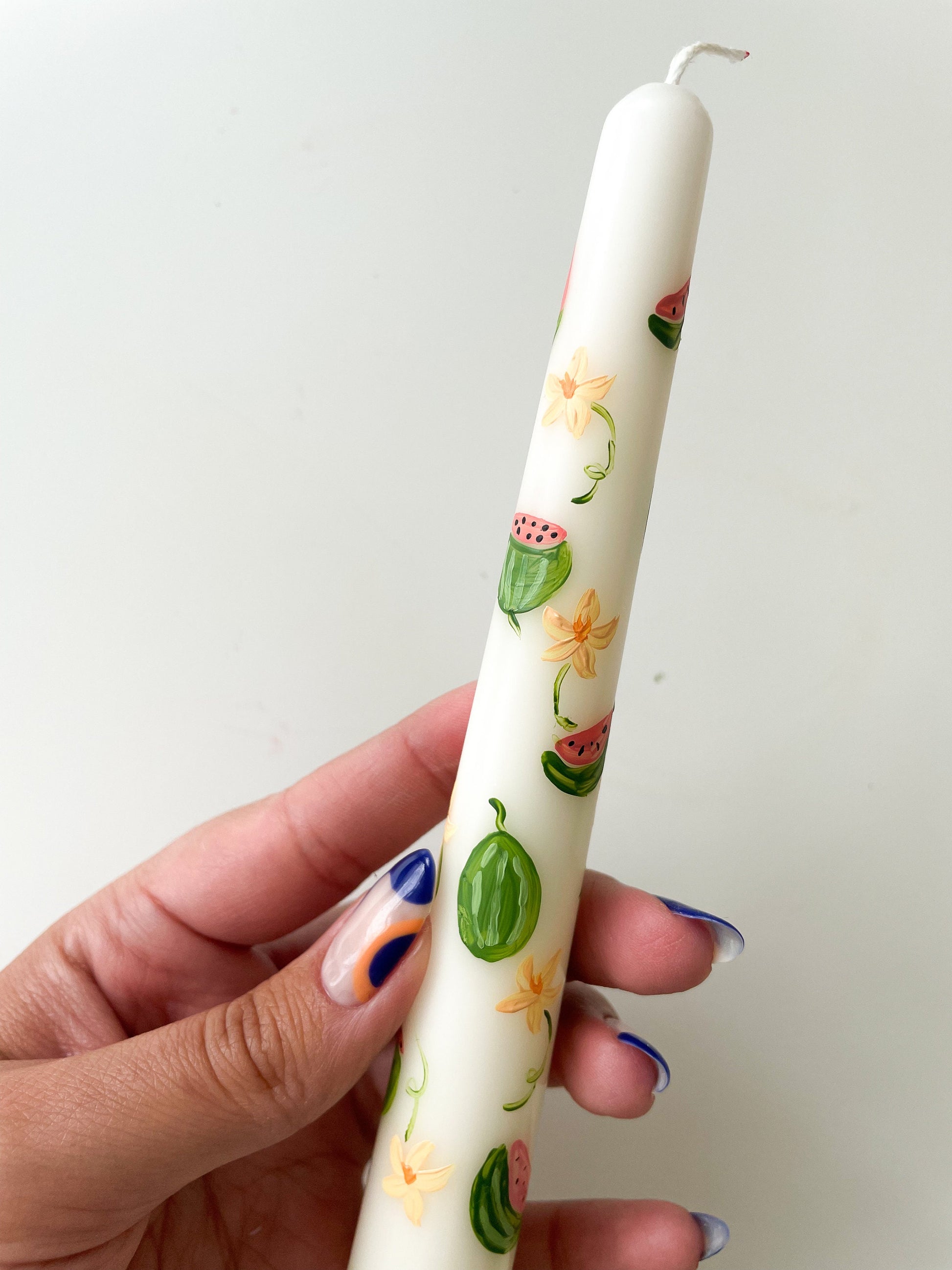 Hand - Painted Taper Candle, illustrated with watermelons & blooms.